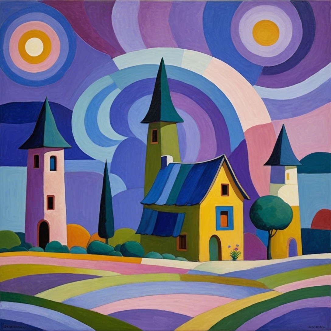 A vibrant, abstract landscape featuring colorful houses with pointed roofs, surrounded by whimsical trees and rolling hills, set against a swirling sky of bold hues and circular patterns.