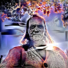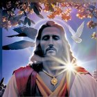Serene Figure Surrounded by Light and Nature Elements