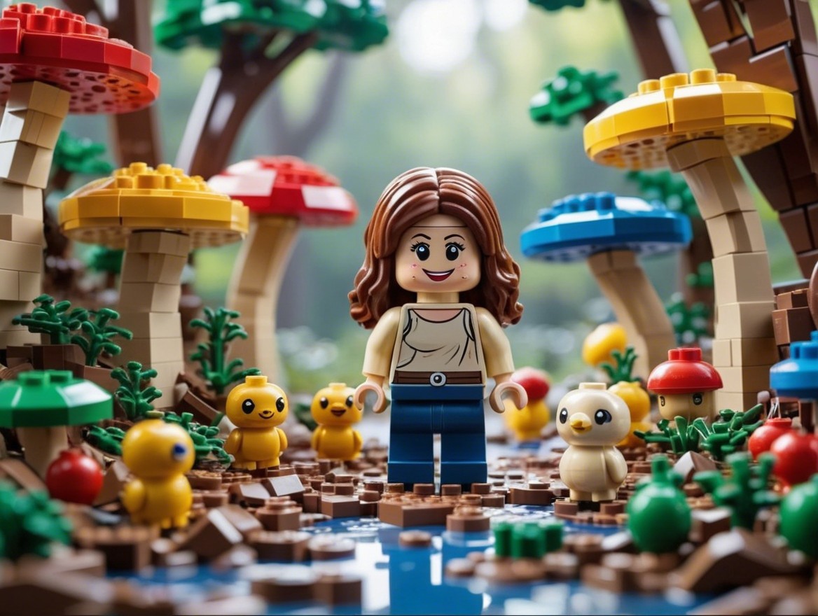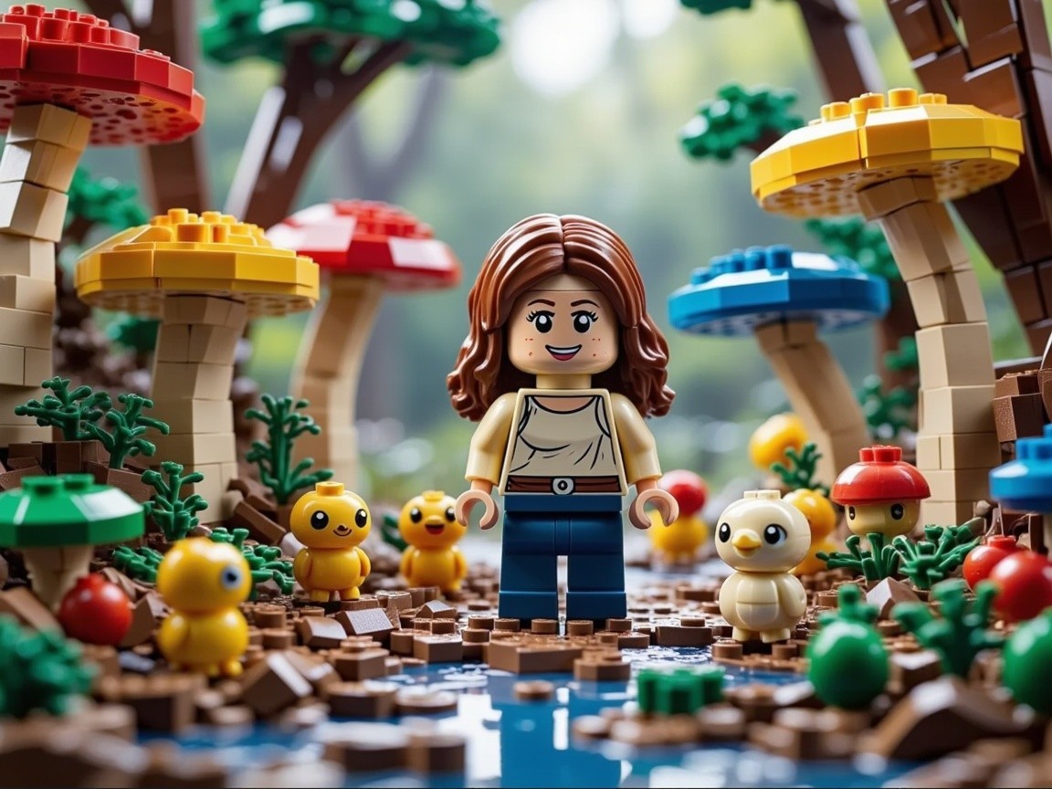 A cheerful LEGO figure stands in a vibrant forest scene with colorful mushrooms and playful animal companions. The lush environment features rich greens and a serene waterway.