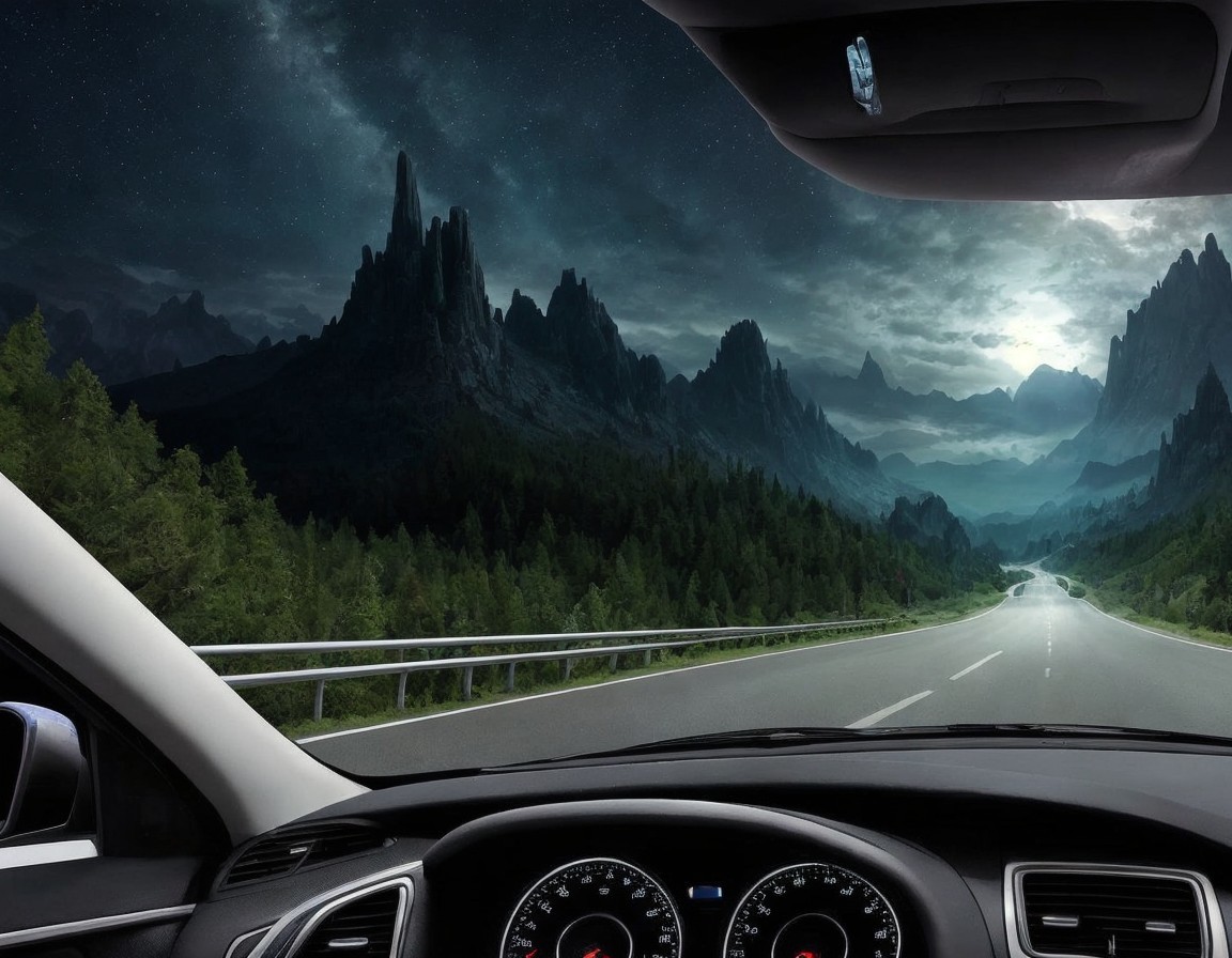 Car interior view driving towards green-covered spires under starry sky at sunset or sunrise