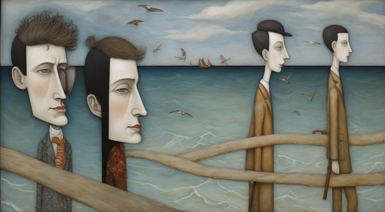 Stylized Figures Walking on a Beach with Dreamlike Atmosphere