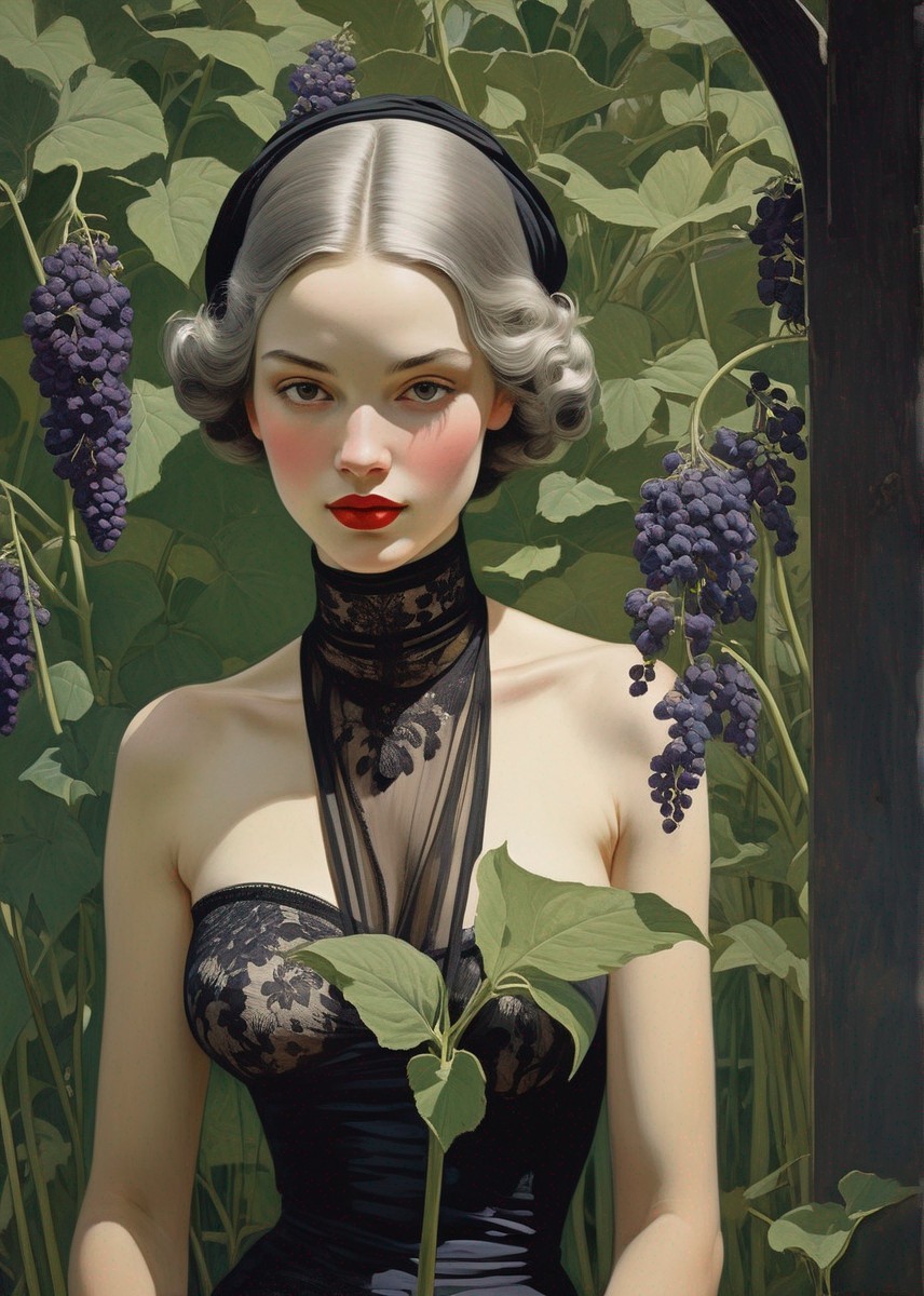 Elegant woman with retro hairstyle and a lace dress posing among leaves and tree shadows.