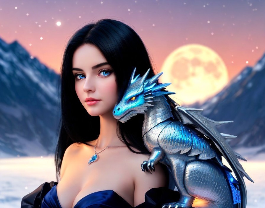 A woman wearing an elegant midnight blue dress with a loyal little blue dragon perched on her shoulder against a moonlit mountainous backdrop.