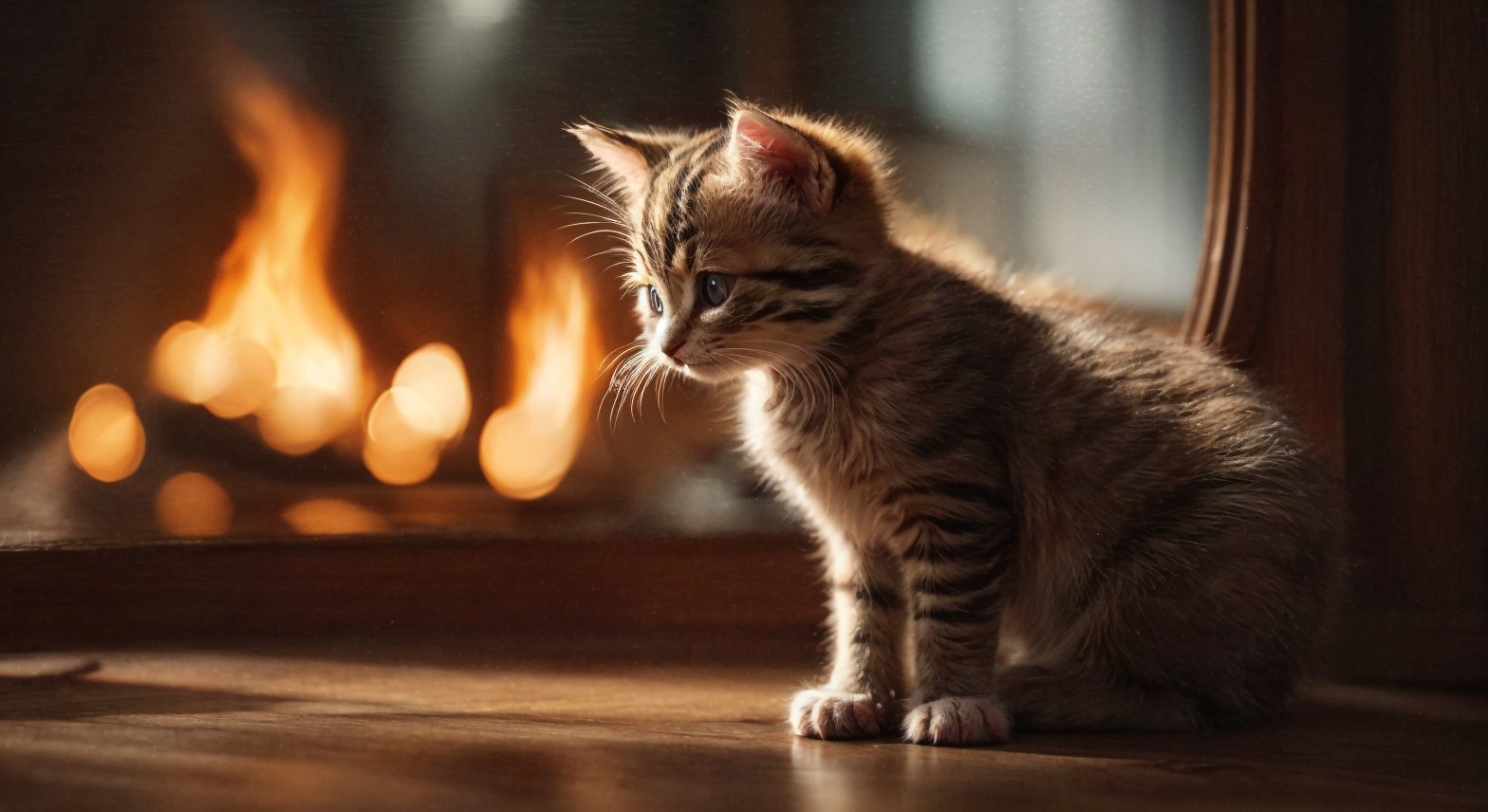 A playful kitten with striking blue eyes sits alertly, illuminated by warm, flickering firelight. Its striped fur adds charm to the cozy scene, evoking a sense of warmth and curiosity.