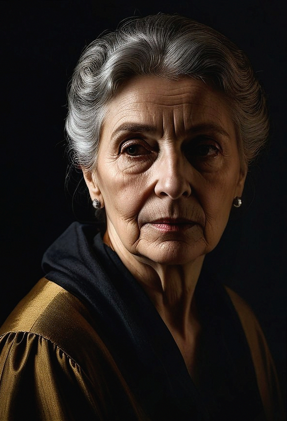 (Try from Gerard) - A poised elderly woman with silver hair and elegant attire gazes thoughtfully, her expression reflective and somber against a dark background, highlighting her dignified features.