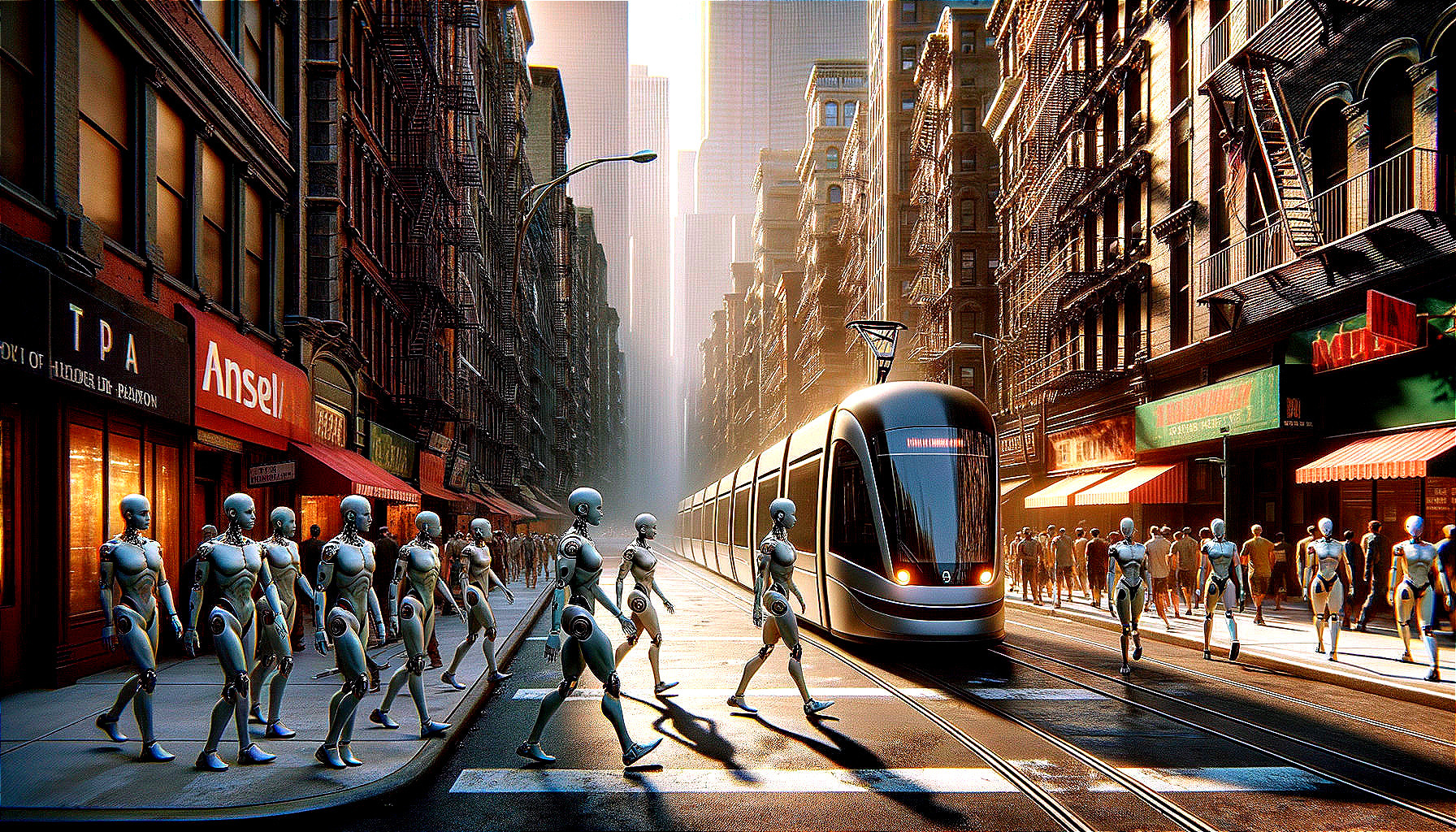 In a futuristic New York, humanoid androids stroll the streets while a high-tech tram glides by. The digital painting captures intricate details, vibrant colors, and dynamic lighting in an ultra-realistic 8k masterpiece. The scene blends fantasy with an elegant and attractive style, reminiscent of classic art techniques and retro sci-fi influences.