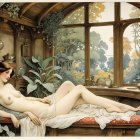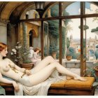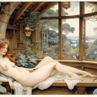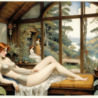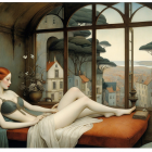 A serene woman in a flowing white dress reads by a window, overlooking a surreal landscape with distant mountains and floating orbs, blending reality and imagination beautifully.