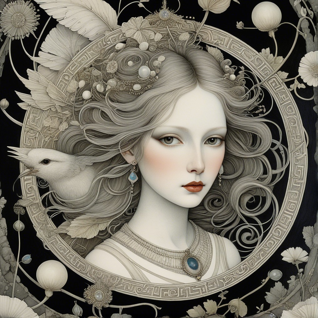 The image features a serene woman with intricate, flowing hair surrounded by celestial motifs. Soft colors and geometric patterns create a dreamlike, ethereal atmosphere.