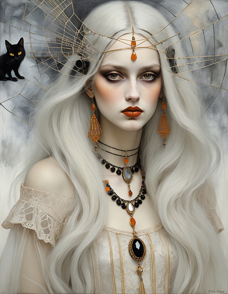 Queen of Halloween. foggy nostalgia, portrait in Burnt umber and salmon gold, smoke and mirrors, patina of, battery acid, art brut, moody, somber, desaturated colors, in the style of Paul Klee, Arthur Rackham Dark and moody oil painting of a woman with piercing black eyes, inspired by the works of John Singer Sargent and Edgar Degas, long shot, realistic texture, dramatic lighting, intricate details on clothing and Magical woman fading tones of melancholy and summer nostalgia, soulful portrait, in burnt umber, plutonium, patina of mercury glass, tea stains, art brut, moody, somber, desaturated colors, in the style of Paul Klee, Banksy, Arthur Rackham, based on Prompt by KRW