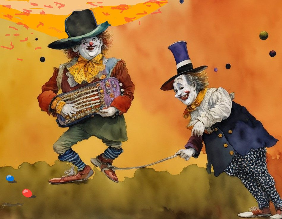 A children's book with watercolor ink, inspired by Quentin Blake. Clowns, the clown with the big hat and holey socks plays the bandoneon, the white clown with the too small top hat pulls the rope tied to the other's foot and laughs loudly, white gloves, earth-colored background with colorful balls
