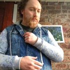 A young man with a red beard wears a floral-patterned sweater, adorned with pink flowers on his wrist. He stands against a backdrop of blossoms and a vibrant painting, exuding an artistic vibe.