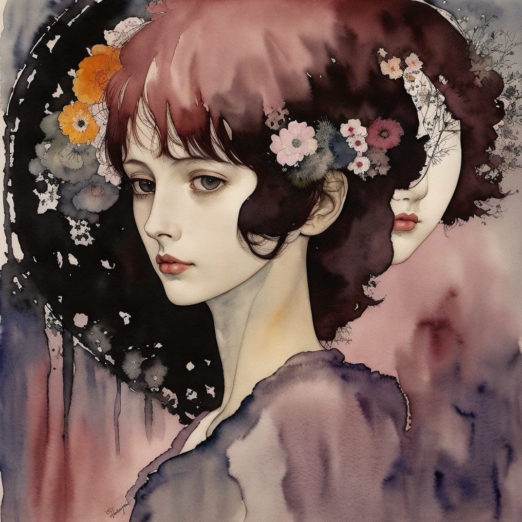 A stylized portrait of a woman with a butterfly in her hair, featuring sepia and black watercolor tones and a striking contrast between her pale skin and dark attire.