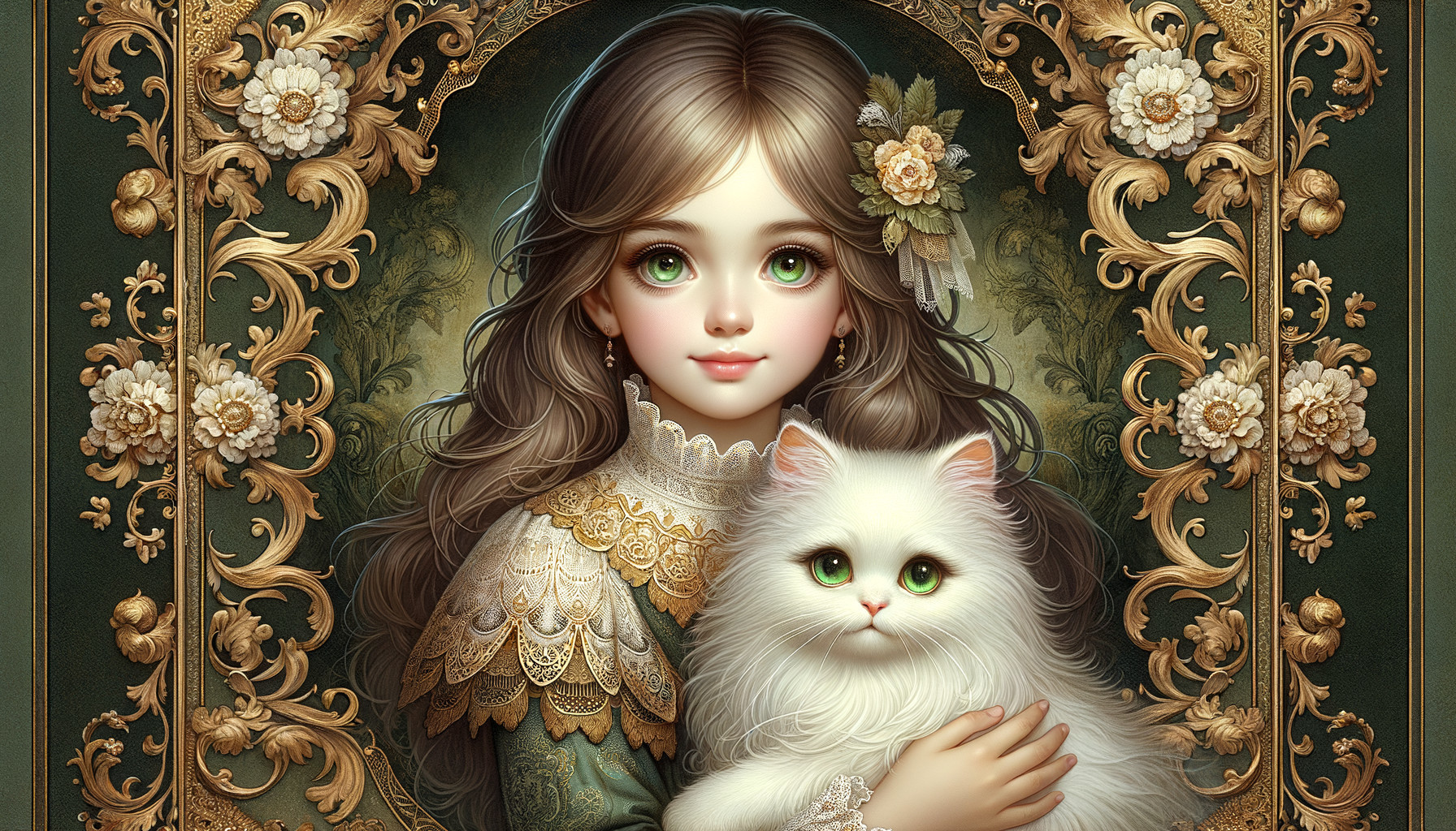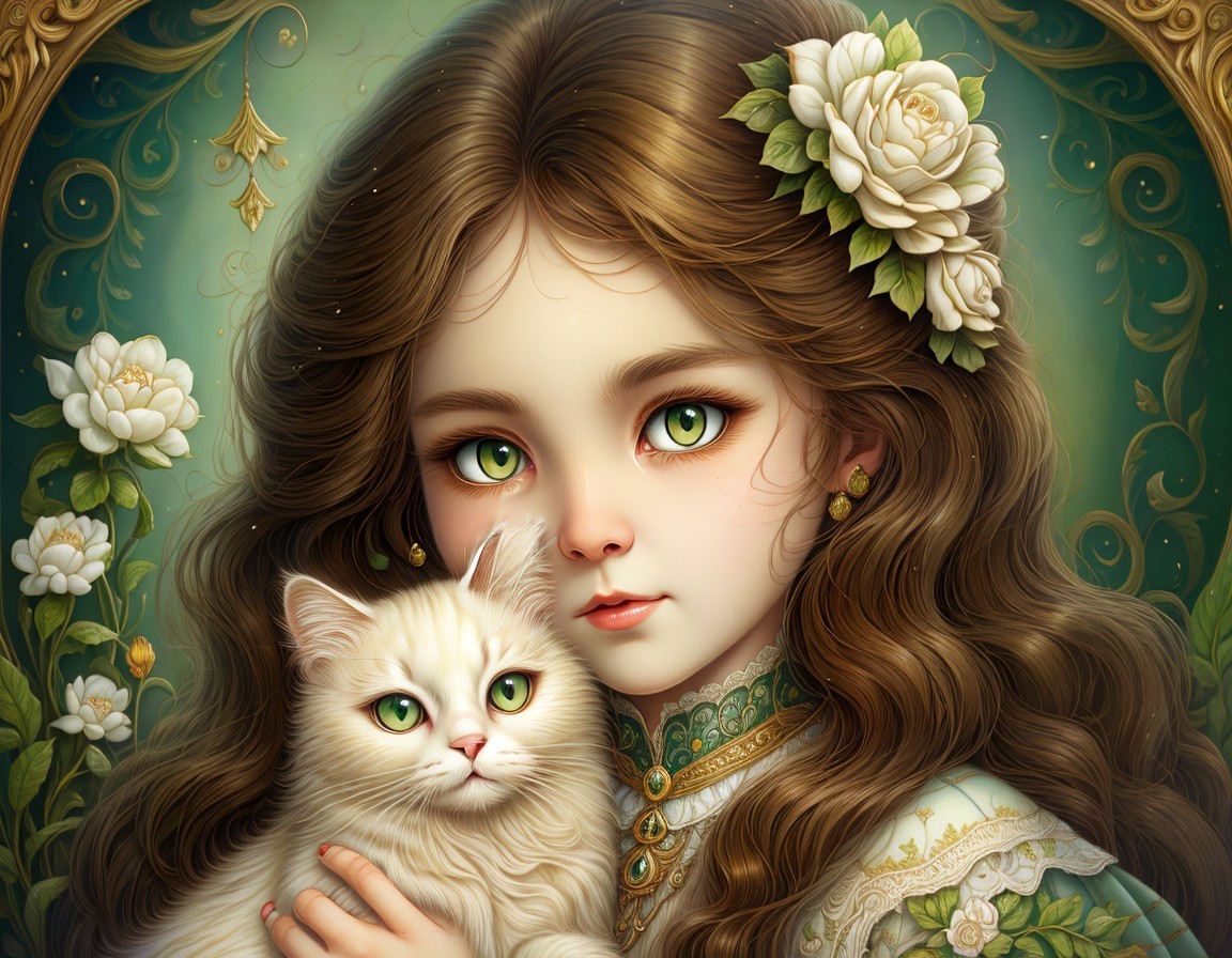 A detailed illustration of a woman with a green dress holding a white cat, surrounded by nature and framed within an ornate border.