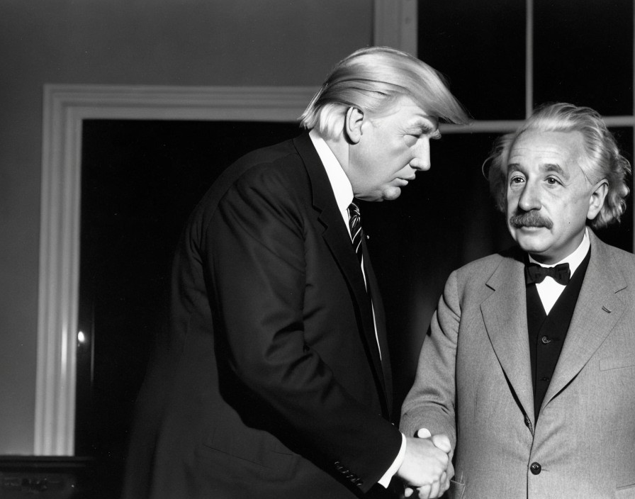 Prompt: Donald Trump goes back to tell Albert Einstein that something has gone terribly wrong with the timeline because there is some guy called Joe Biden sitting in the White House and that he needs to do something to fix it.