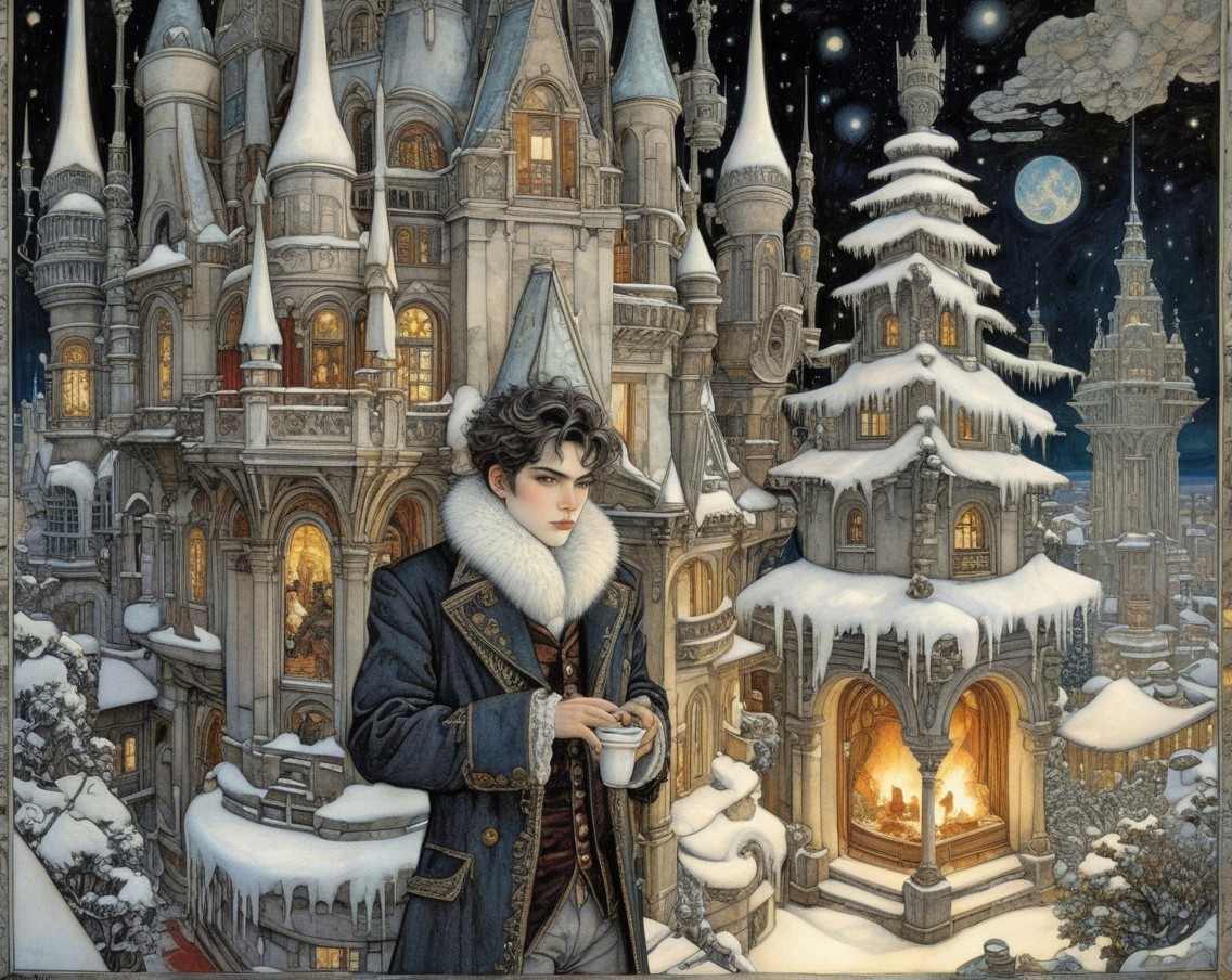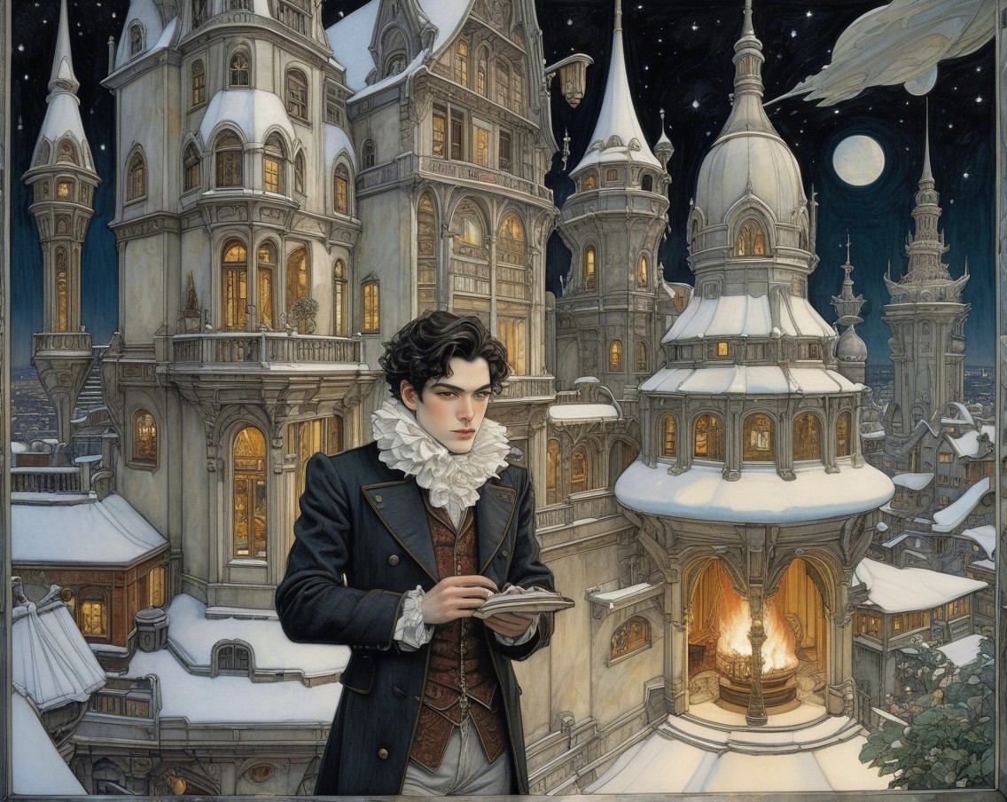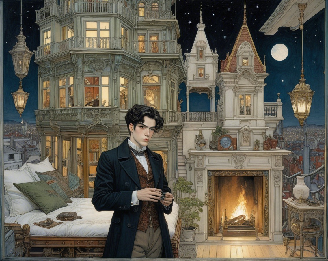 A person dressed in a pinstripe suit sits in a beautifully appointed room with large windows. Outside, a picturesque cityscape features ornate buildings and a distant skyline, evoking a sense of nostalgia.