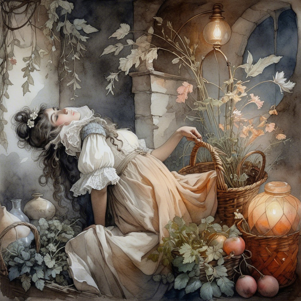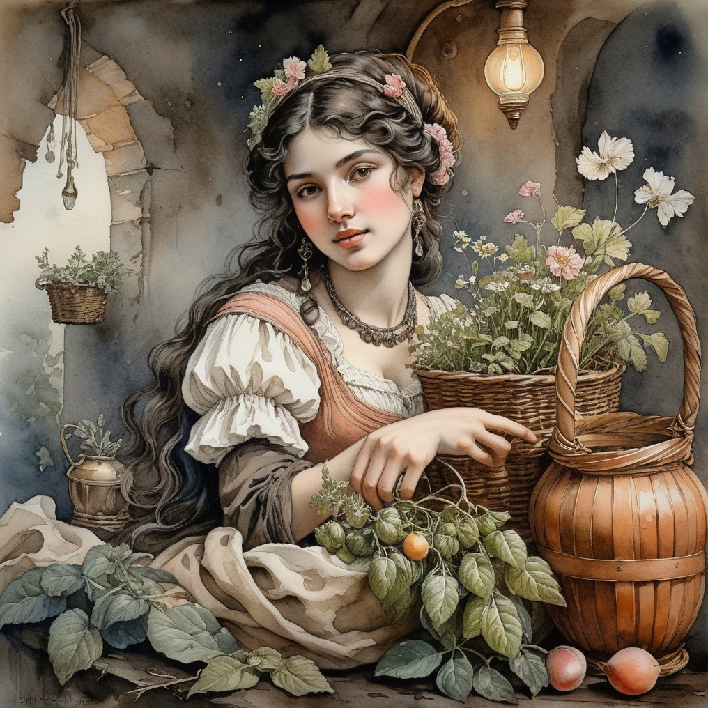 . Gypsy lady collecting herbs in basket , colored ink drawing, watercolor artwork on old withered paper, vintage, by Caravaggio, Fragonard, Anton Pieck, pale colors, high detail, intricately detailed, hyperdetailed volumetric lighting, art nouveau graphic steampunk ., whimsical, beautiful, poignant, touching. colors blush bronze, black. soft watercolor extra water in magical realism by Annigoni, Egon Schiele, Milo Manara, Botticelli, Catrin Welz-Stein, Jean Metzinger, Klimt, perfect eyes, perfect handsface, highly detailed, complementary colors, hyper detailed. Watercolor and ink splatter, dynamic pose, dark blue background, unreal engine, alphonse mucha, global illumination, detailed and intricate environment Beautiful woman in the style of Pino Daeni Dorota Piotrowiak Edward Gorey, junji ito, klimnt , gold leaf color, silver leaf color beautiful dynamic lighting high definition hdr * Random prompt award winning Max Ernst ultra detailed 4K 3D Texture