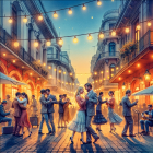Couple Dancing in Festive Street with Shops and Lights