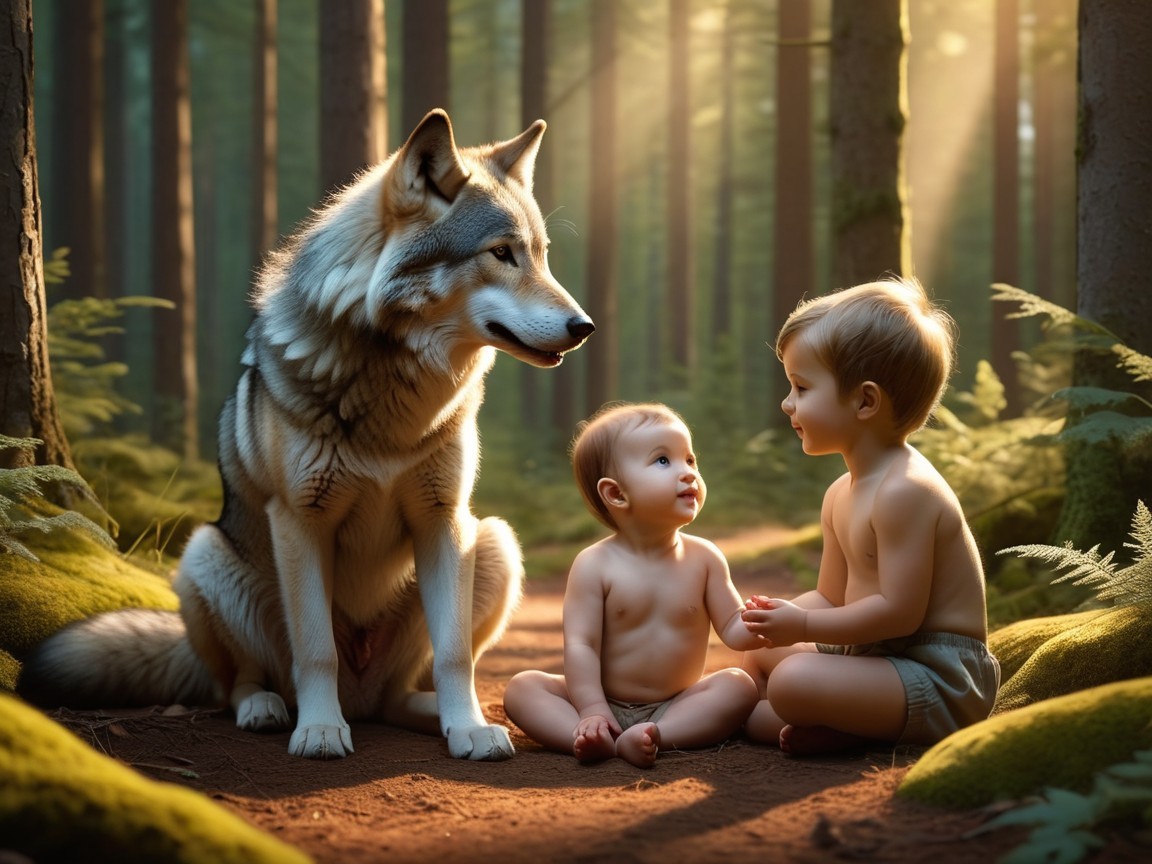 In a serene forest, a wolf sits beside two curious children. The light filters through the trees, creating a magical atmosphere as they share a moment of wonder and connection.