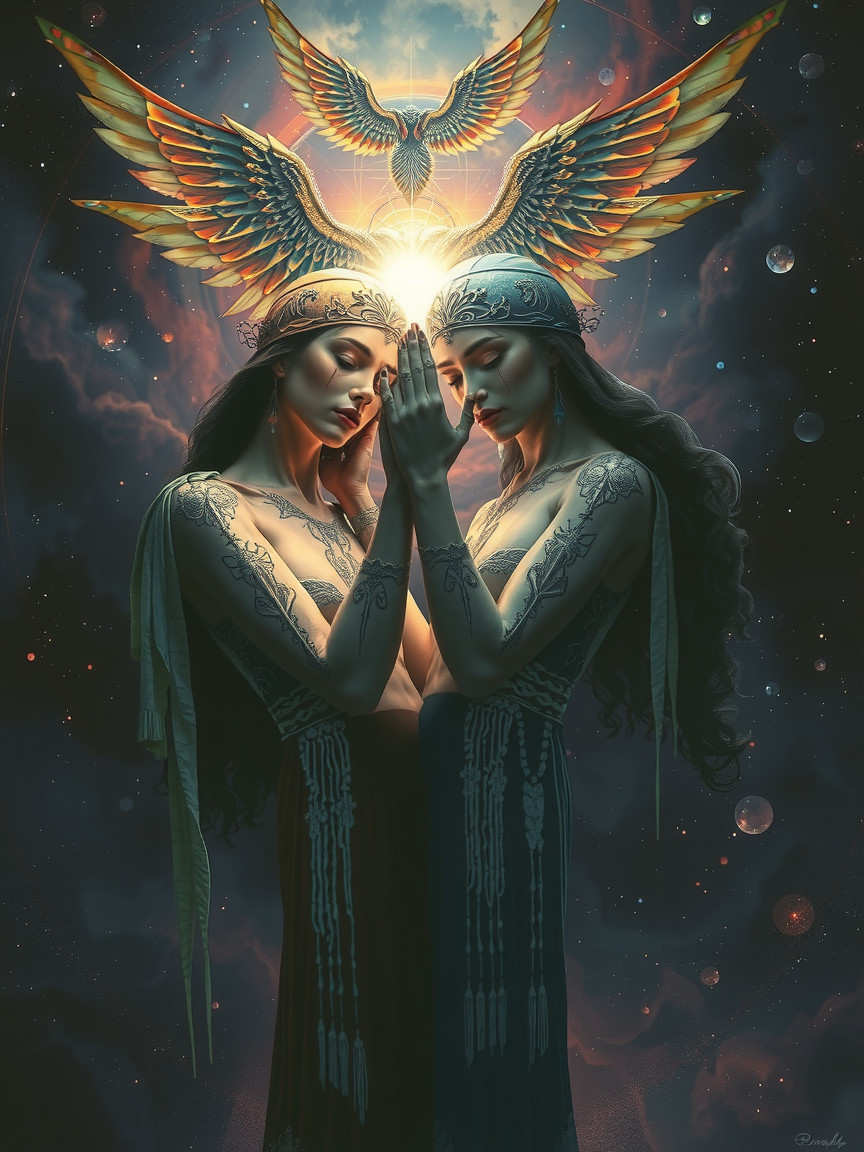 Couple with Tattoos in Cosmic Setting and Vibrant Colors