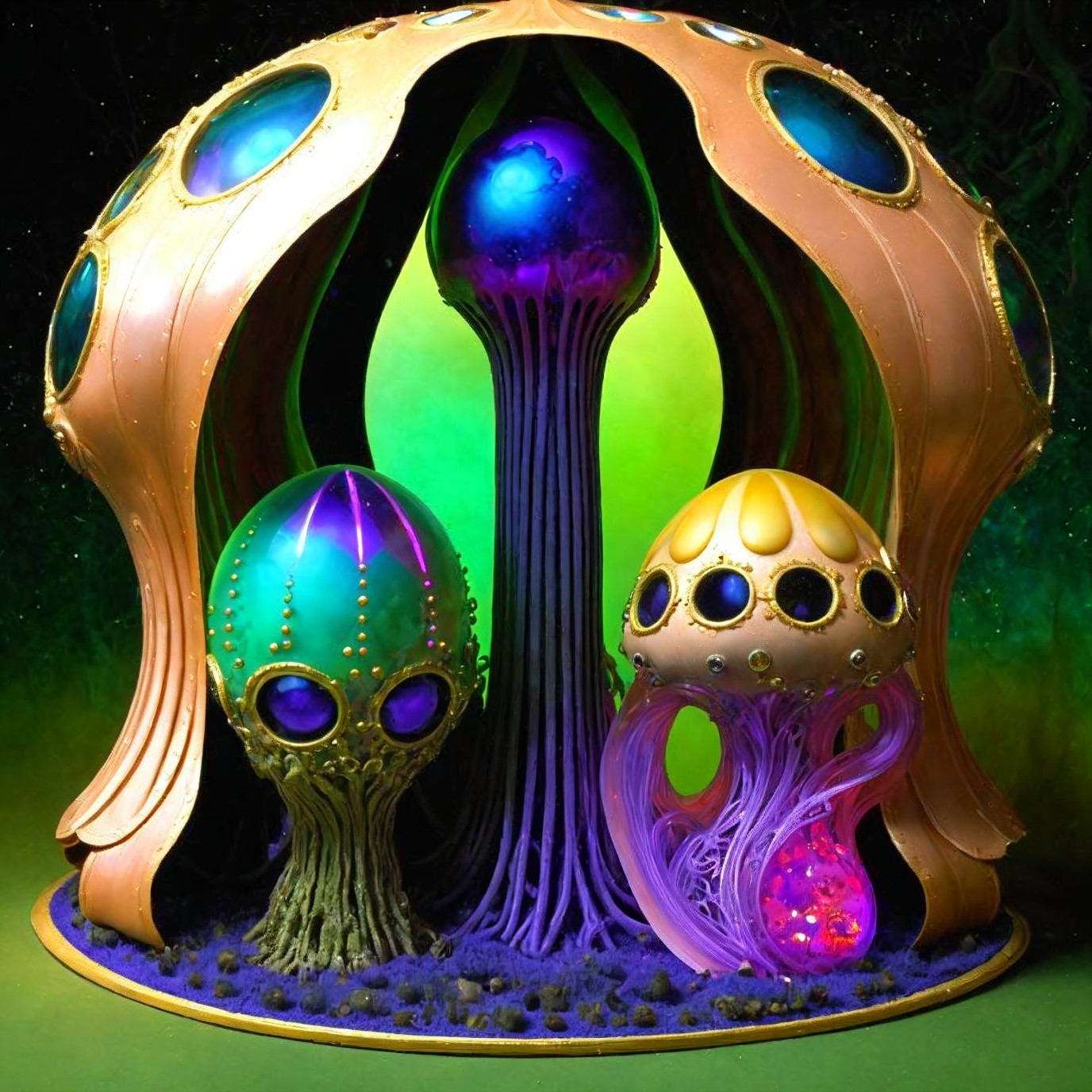 A whimsical sculpture depicting colorful, mushroom-like alien entities with glowing orbs, set against a starry background.