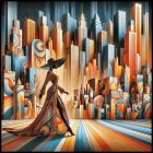 A stylish figure in a vibrant, patterned gown walks through a futuristic cityscape, characterized by bold orange and blue colors, with towering buildings and swirling designs creating a dynamic backdrop.