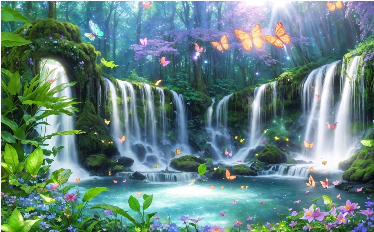 Enchanted forest glade, vibrant blooming flowers, ancient towering trees, mystical glowing fireflies, sparkling cascading waterfall, iridescent butterfly wings, ethereal floating orbs, whimsical woodland creatures, soft dappled sunlight, lush greenery, magical atmosphere, fantasy realm, digital painting, high detail, rich color palette of blues, greens, purples, and golds, enchanting lighting effects, by Brian Froud and Alan Lee, Artstation.