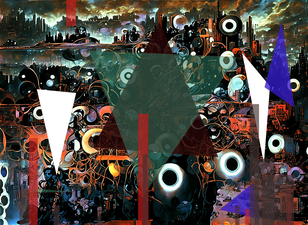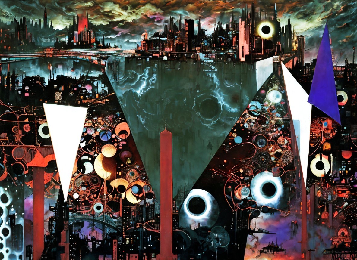 + Prompt:Dystopian mixed media. Medium shot. Giant Silhouette witch figure sitting on bridge, with legs dangling in the void. A dark cityscape with towering skyscrapers, black hole in the sky, and bridges leading to the city. Comics style. Vibrant psychedelic cloud colors swirling around the void. Beksinski-like eerie atmosphere, Bill Sienkiewicz-inspired bold textures. Colors blending and bleeding, dark city lights reflecting in the purple and pink hues of the clouds. Sharp shadows, intricate miniatures within the cityscape. Mixed media collage feel, bold brushstrokes, detailed work, strong contrast, high definition, cinematic colors, dynamic lighting, bold colors, frenetic visuals, illustration quality
