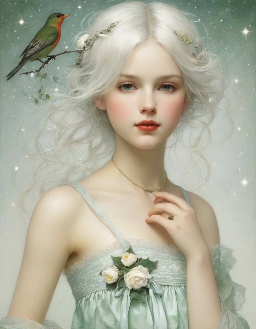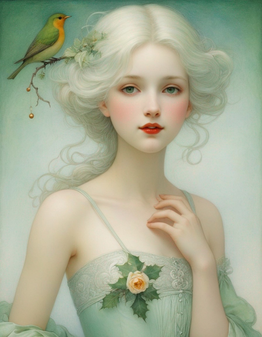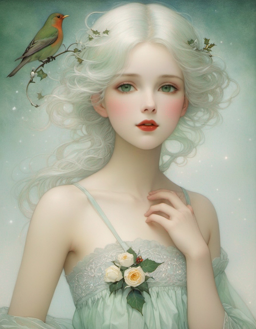 Prompt: Single image. Christmas. When I think about my time with him, it was mindblowingly tender. Insanely delicate, but with a physicality that makes me ache. colors: seafoam, green, marigold, flame, scarlet, french rose.