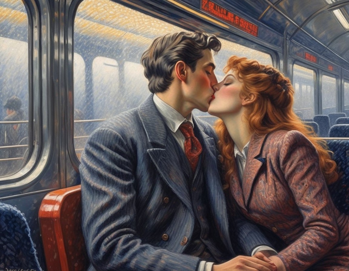A romantic painting of a a man and a woman kissing inside a vintage train, with a cityscape visible through the window.