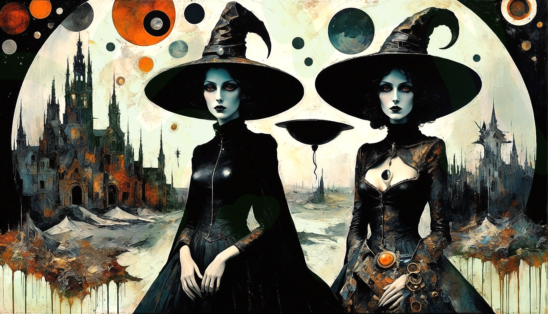 Twin witches in black attire with cosmic-themed hats stand before a castle, surrounded by surreal planetary imagery.