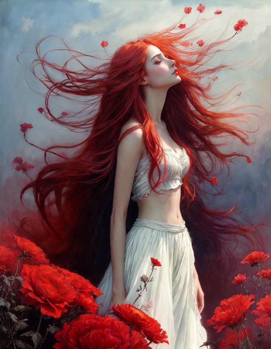 A woman with flowing red hair stands amid red flowers, evoking a dreamy, ethereal atmosphere.
