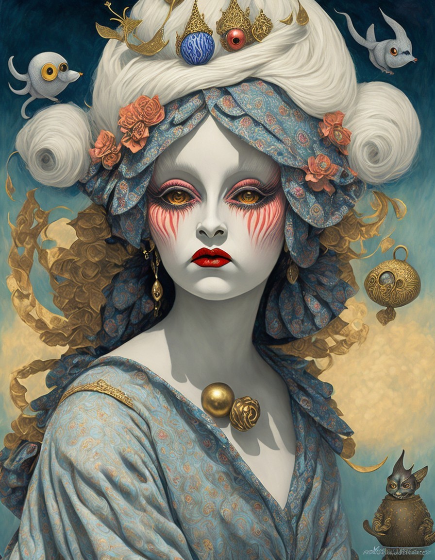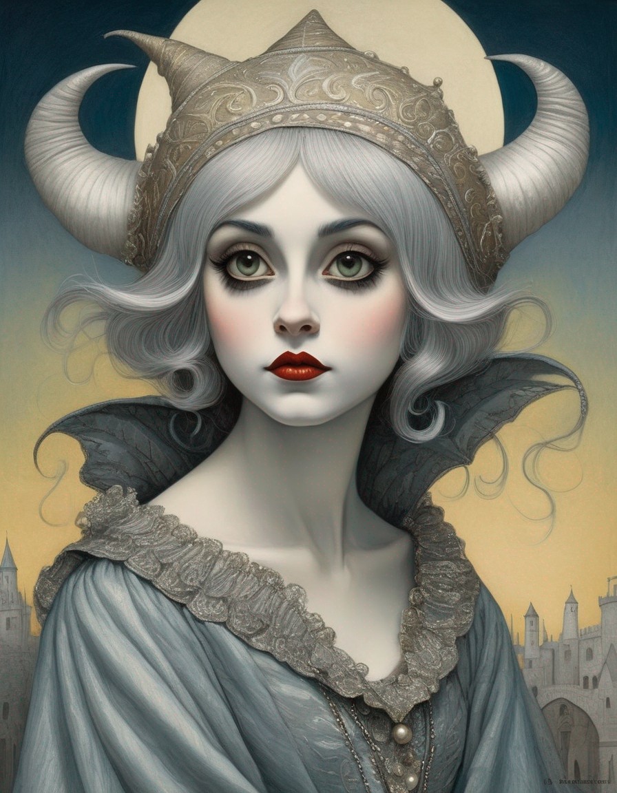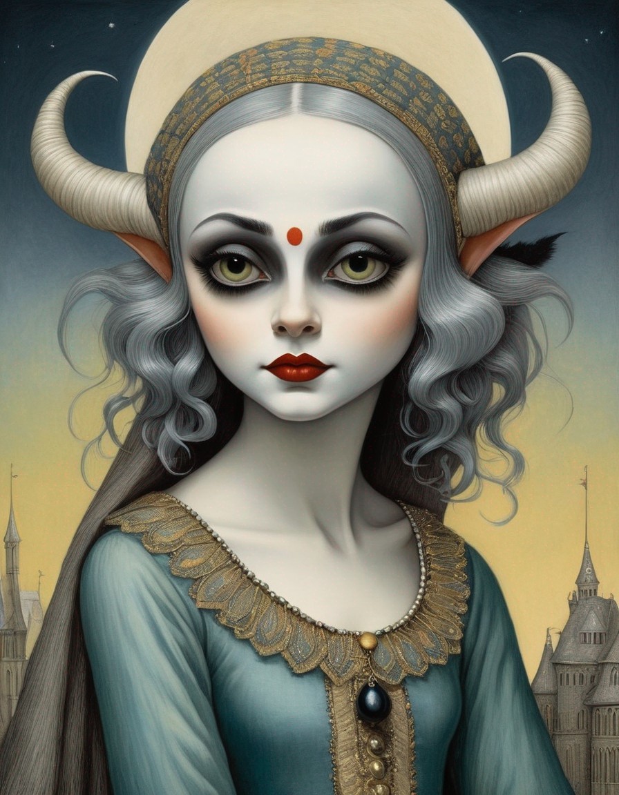 A surreal portrait of a woman with exaggerated, doll-like features, wearing a vintage dress and a decorative hat, set against an old town backdrop.