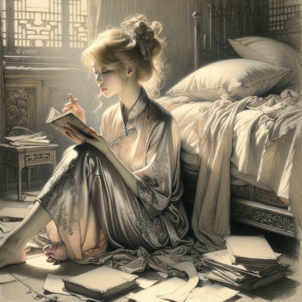 A woman in a silk robe sits by a bed, reading and surrounded by books, in a room with warm light filtering through a window.