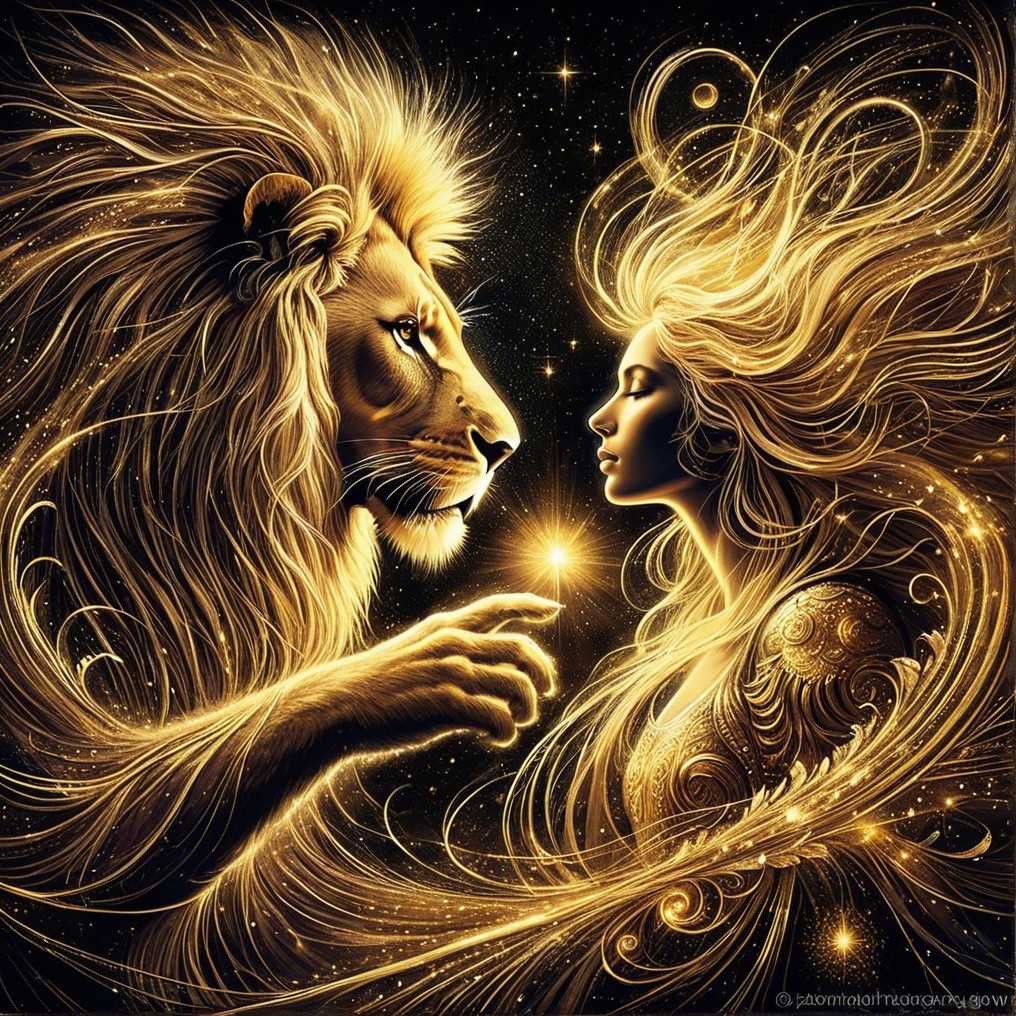 The image features a majestic lion and a woman with flowing golden hair, both surrounded by a starry cosmos. They appear to connect with a glowing light between them, symbolizing harmony and unity.