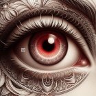 An artistic close-up of a striking eye featuring vibrant red and turquoise colors, surrounded by a glossy, textured surface resembling organic material with beads of moisture.
