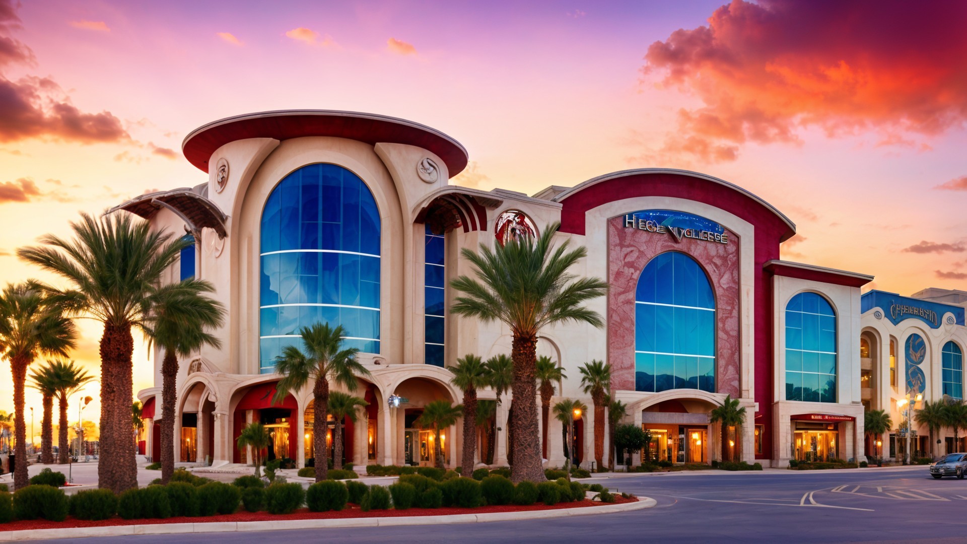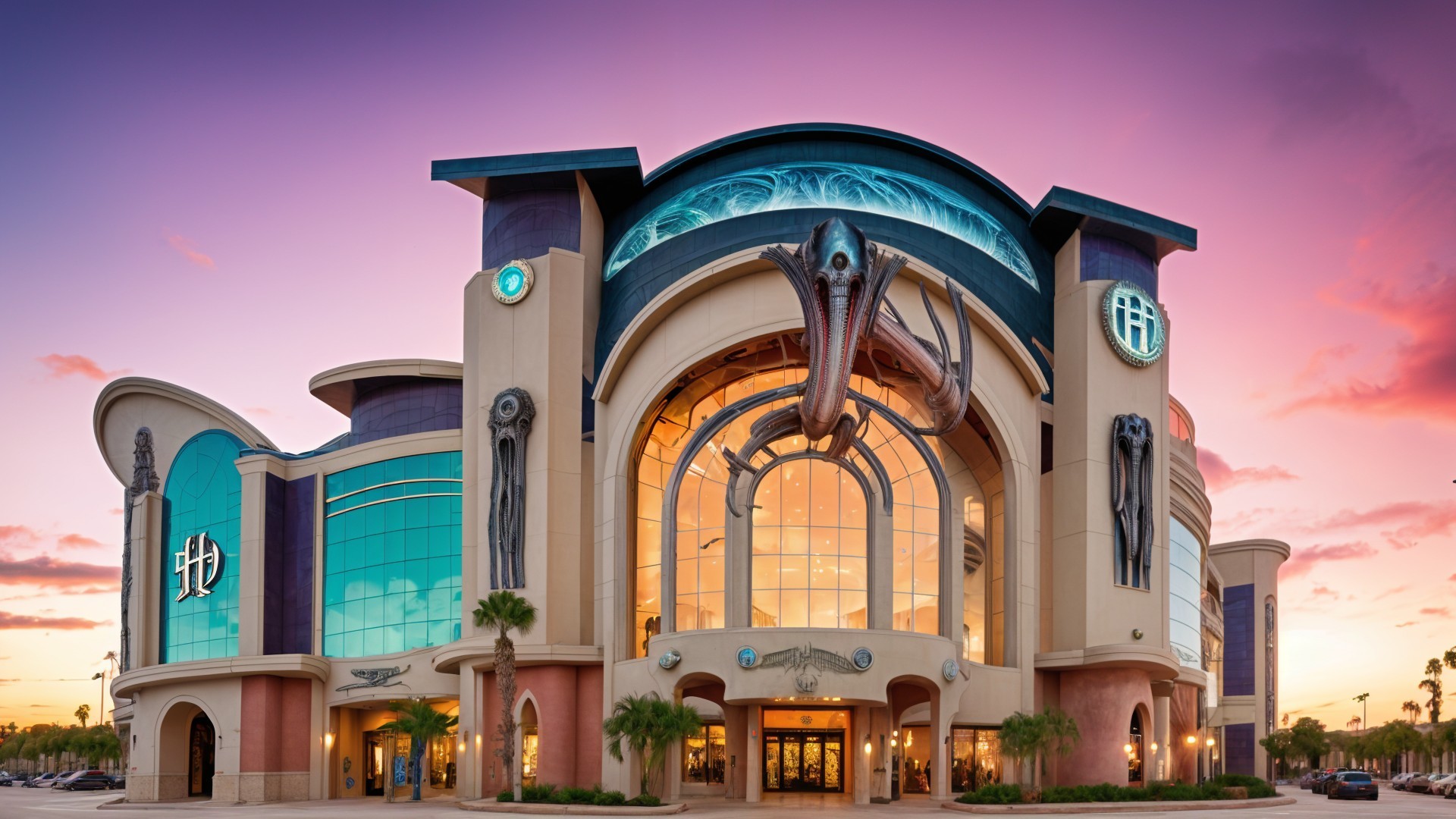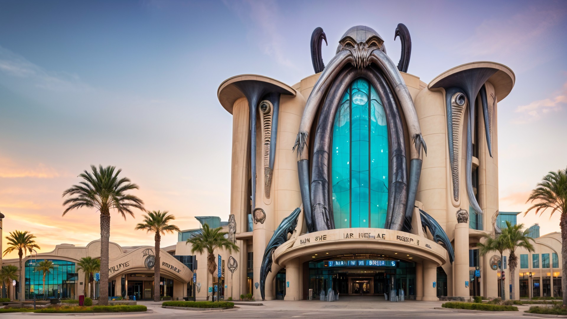 A futuristic building features intricate, organic forms resembling flower petals. Bathed in warm light, it stands amidst palm trees, showcasing an imaginative blend of architecture and nature.