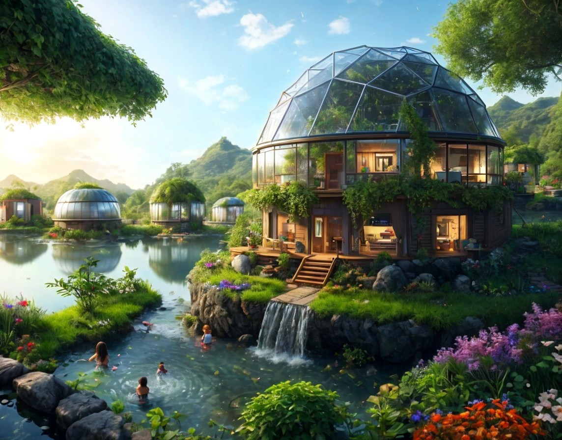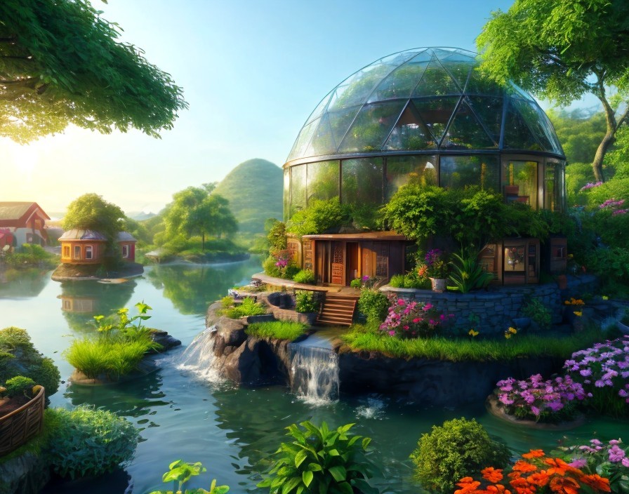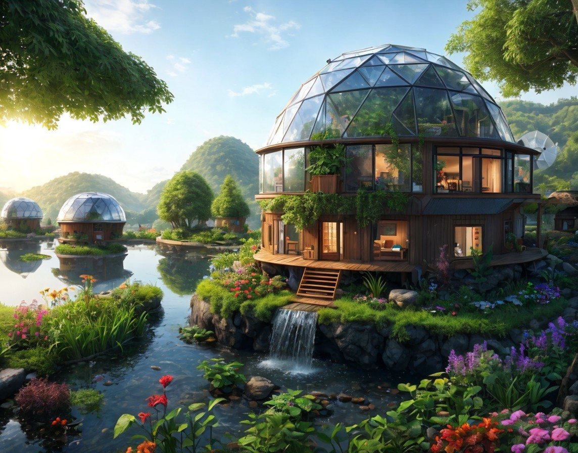 A serene futuristic dome house amidst lush greenery, by a tranquil stream with blooming flowers and a small canoe.