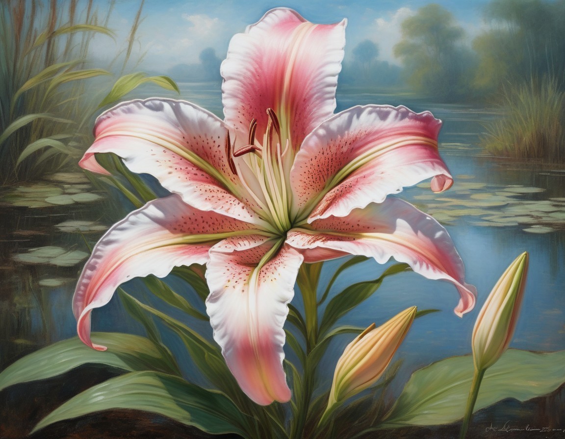 Prompt: "Stargazer Lily. A beautiful and romantic landscape of beauty with stargazer lilies in a romanticized image, in the style of John William Waterhouse, J. M. W. Turner, John Constable. Soft blues. Landscape, nature, beauty. Focal point of the lilies."