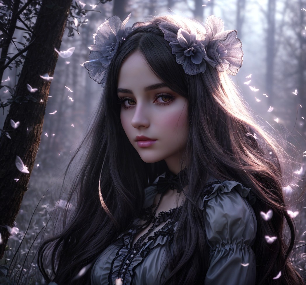 Prompt: 3D, a beautiful ghost on meadow, charming enchantressin black frilly, beautiful female face, detailed garments, eerie, calm, charming, flowing, occult, glowwave,, long flowing dark hair, ghostly, translucent, hauntingly beautiful, small glow with and back-lit,grey rim lighting, acid spill, embossed strokes, inkpunk 1.8, 3d effects 1.8, ambient occlusion 1.5, shadow mapping 1.3, anisotropic filtering 1.7, dynamic lighting 1.7, raytraced shadows, ethereal, otherworldly, triadic color scheme black green beige, raytraced shadows, Filigreed with the finest strokes, brightness 1.9, vector 9:5, stylized, geometrical, tints of dark fantasy, beautiful composition, realistic daguerreotype photography, tints of steampunk art