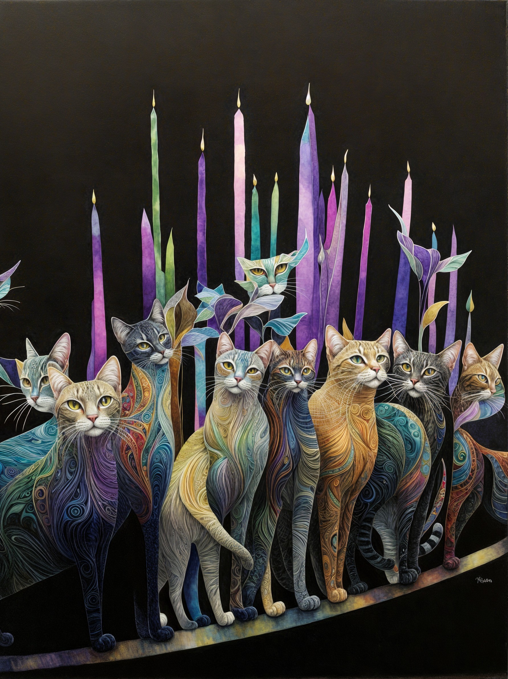 Prompt: A choir of very tall, thin, colorful cats, intact anatomy, anatomically correct, each cat has a necklace made from 3D notes strung together, one cat has a tophat askew on his head, another cat has a red wide-brimmed half height hat, they look very delightful, correct anatomy