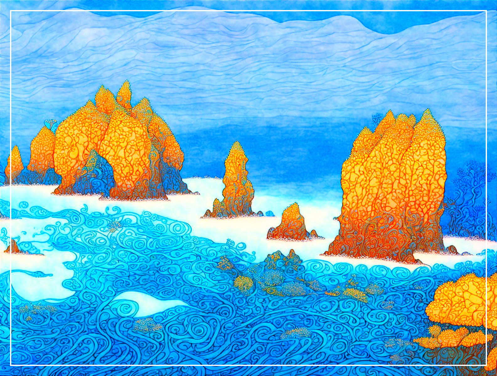 + Prompt:Fantasy blue biomorphic fractals, frost, red pinnacle rocks, white winter, ocean waves, stormy clouds, surreal, Intricate detailed artistic drawing, extremely-detailed line art, in the style of Aubrey Beardsley and Paul Corfield and George Callaghan. beautiful pinnacle towers, Fantasy, surreal, lush, and green garden, a garden of laboring and prayer, yellow light scissored through the rocks, surreal, beautiful high-definition acrylic art with intricate details Jacek Yerka epic extremely detailed dynamic lighting high definition sharp focus Award-winning photography intricate 8k crisp quality Nikon D850 sharp focus dof extremely detailed very attractive beautiful dynamic lighting imperial colors fantastic view close up high definition crisp quality colourful hdr vibrant insanely detailed Jacek Yerka elaborate great depth and scale naoto hattori light reflections Fluorescent fit the subject within the picture frame no asymmetries or deformities scene color's harmony