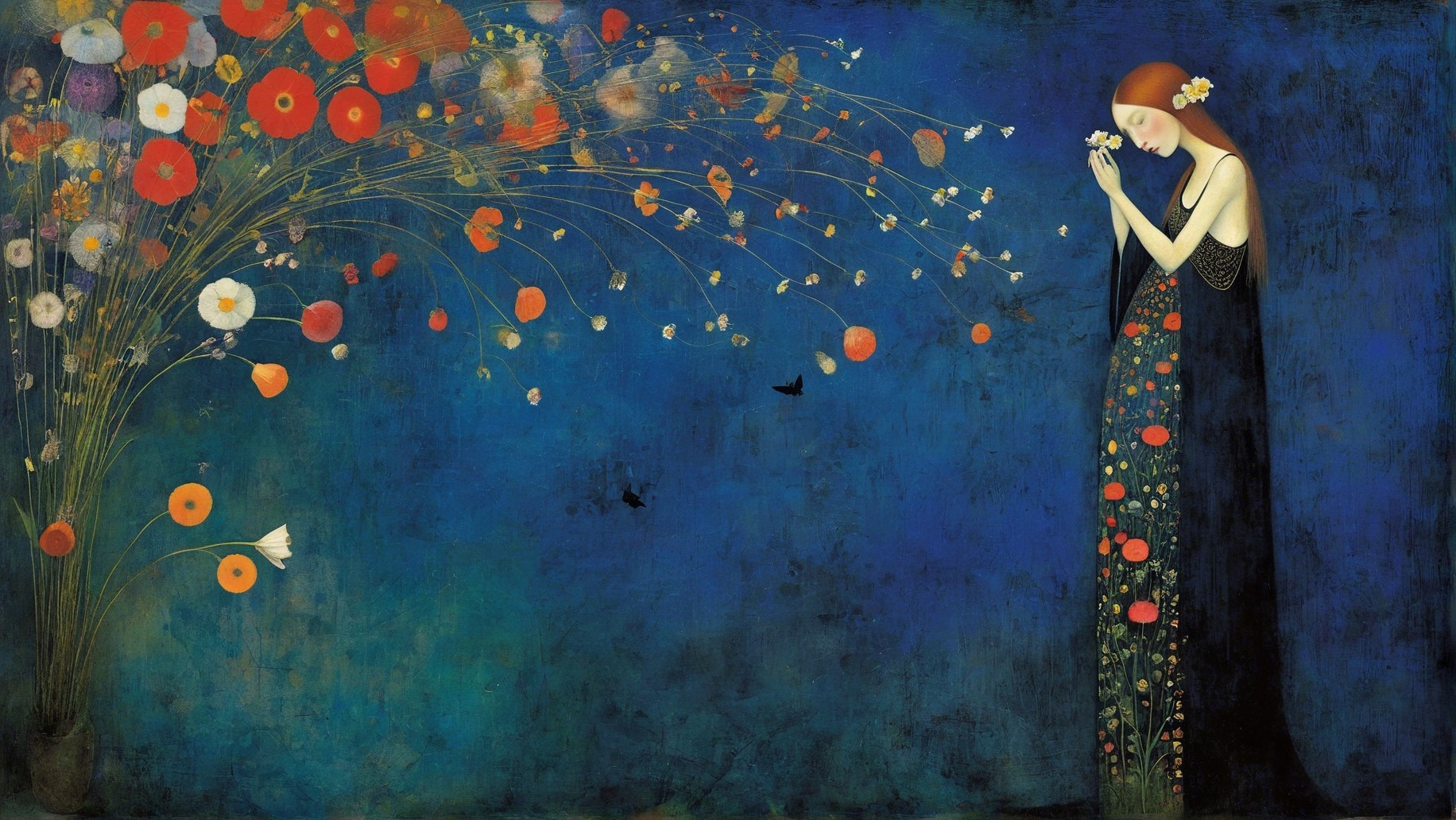 A serene figure in a flowing dress stands among vibrant flowers, gently holding strands of plants. Colorful butterflies flutter in a dreamy blue background, creating a tranquil, magical atmosphere.