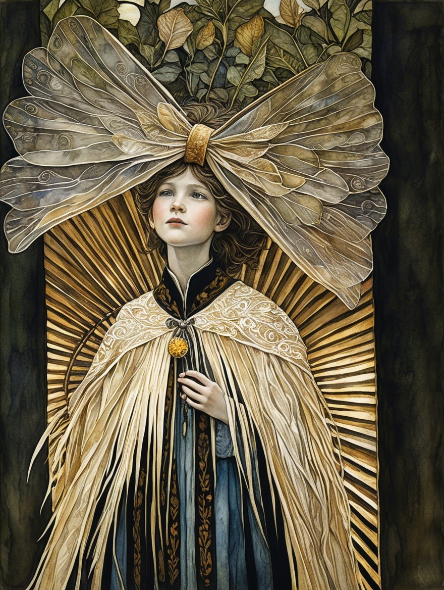 Two young girls stand together in a lush, forested setting. They have long, flowing hair and wear delicate, vintage-style dresses. Their gazes are soft and contemplative, surrounded by nature.
