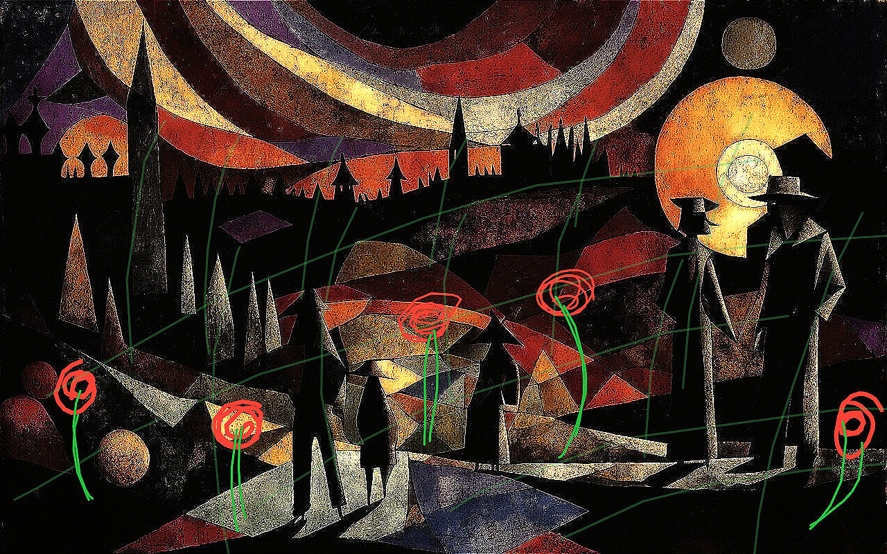 The image depicts a stylized, abstract scene with figures in dark attire, surrounded by vibrant colors and whimsical shapes, set against a backdrop of a surreal landscape and a moonlit sky.