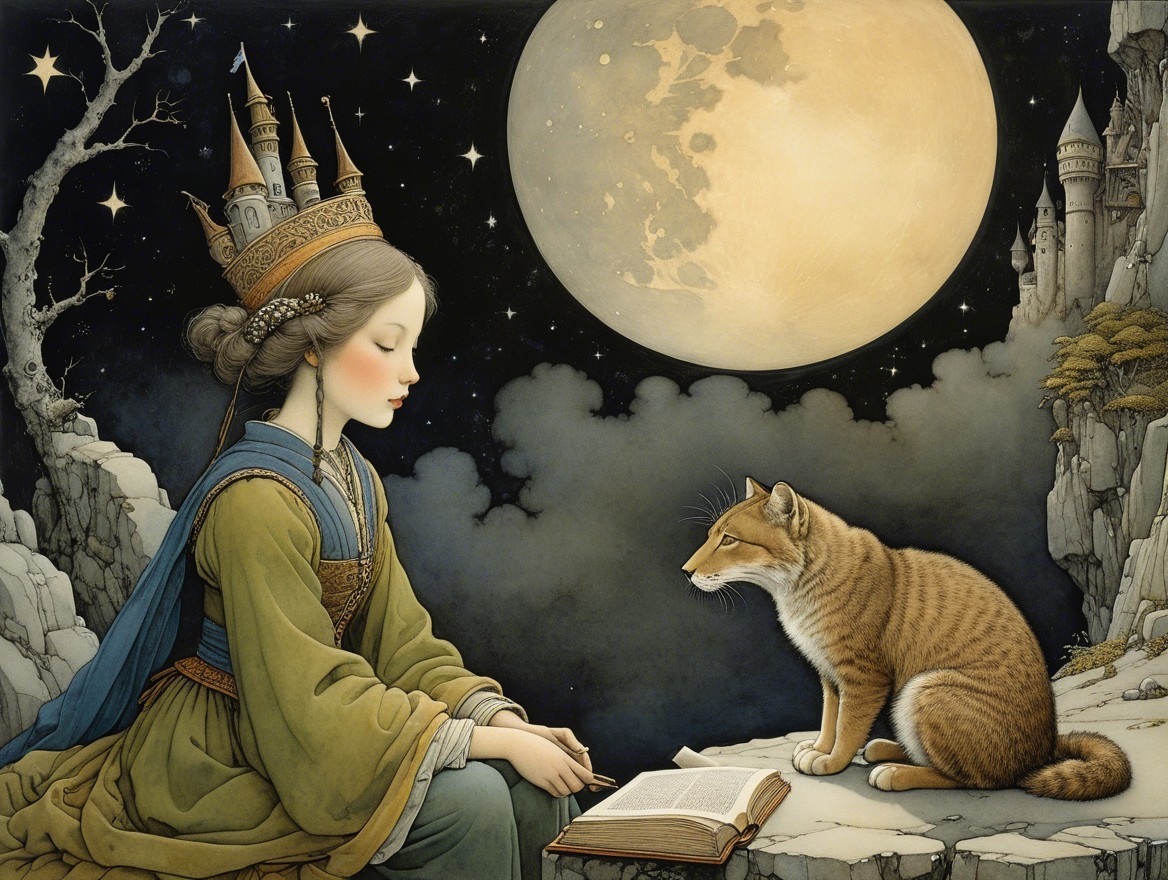 A serene woman in elegant attire gazes at a large moon, beside her sits a striking tabby cat. In the background, a mystical castle enhances the enchanting atmosphere.
