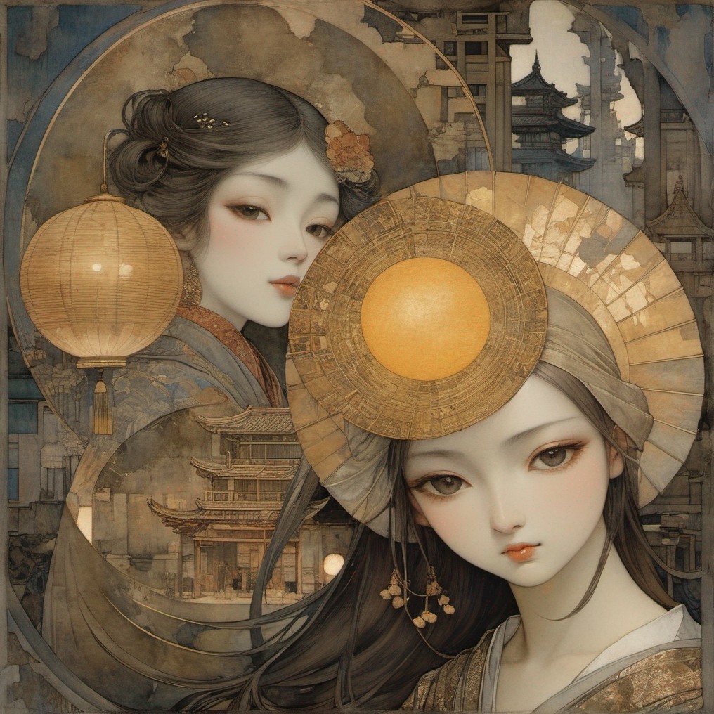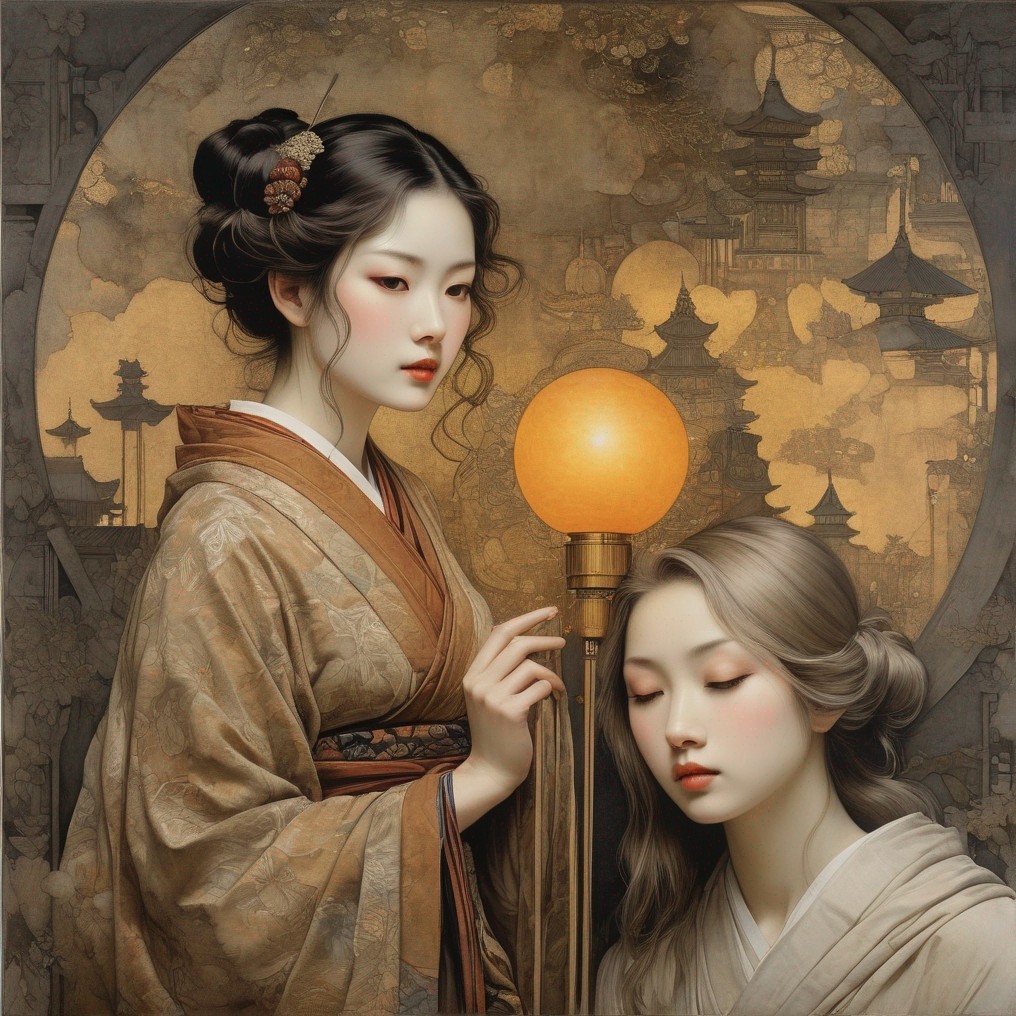 An artwork portraying a woman in traditional Asian attire, holding a lit lantern, with intricate patterns and soft colors in the background.