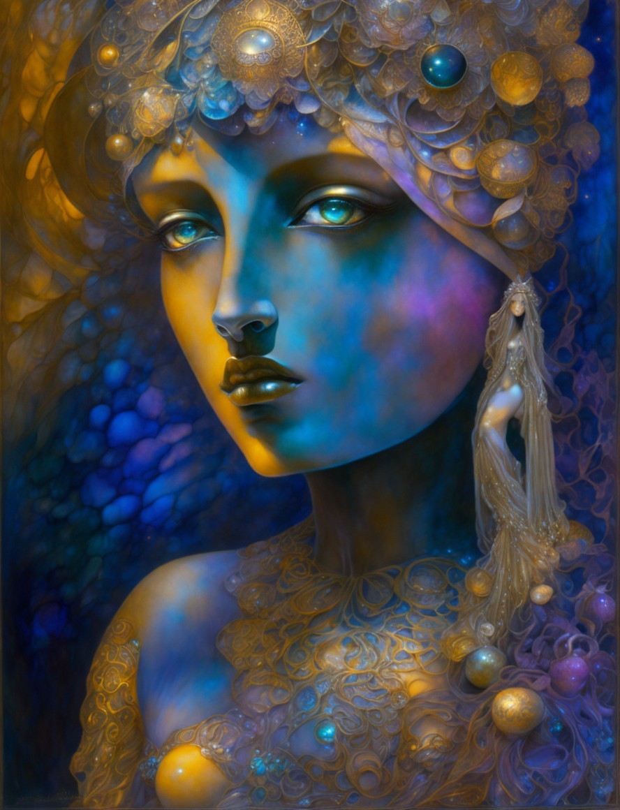 A portrait of a woman with striking blue eyes, adorned with a jeweled crown and elegant attire, set against a blue background.
