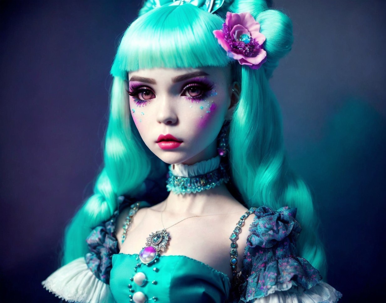 A person with vibrant teal hair and a Victorian-style dress adorned with flowers and jewels, featuring colorful makeup.