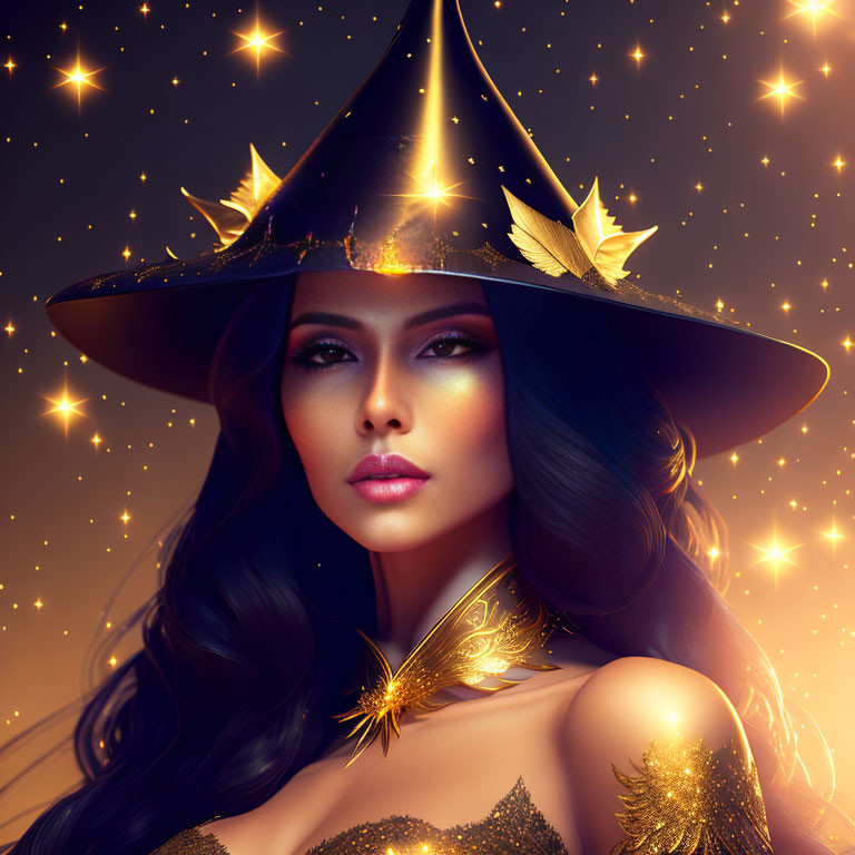 A centered full body render of a beautiful witch with a pointed witch hat With golden wings, black-golden fine lingerie, cute face, artistic starry sky background,