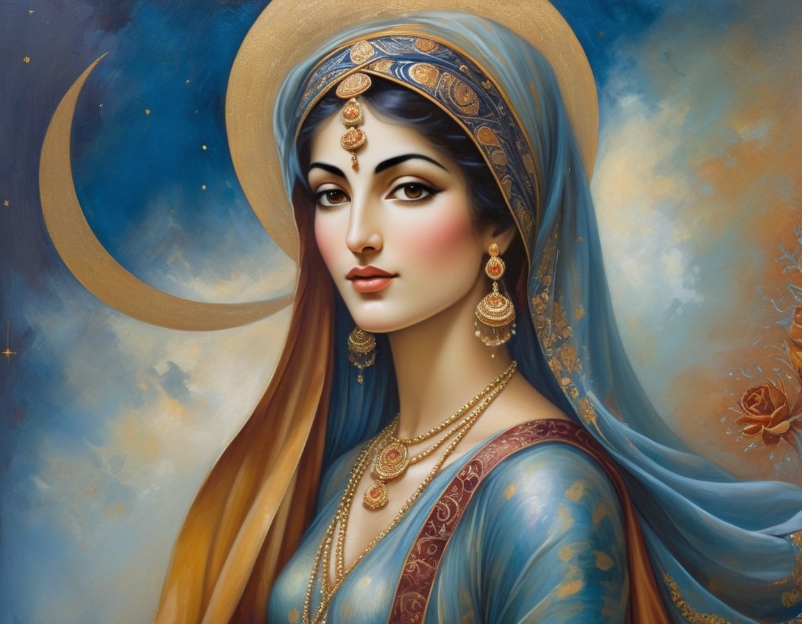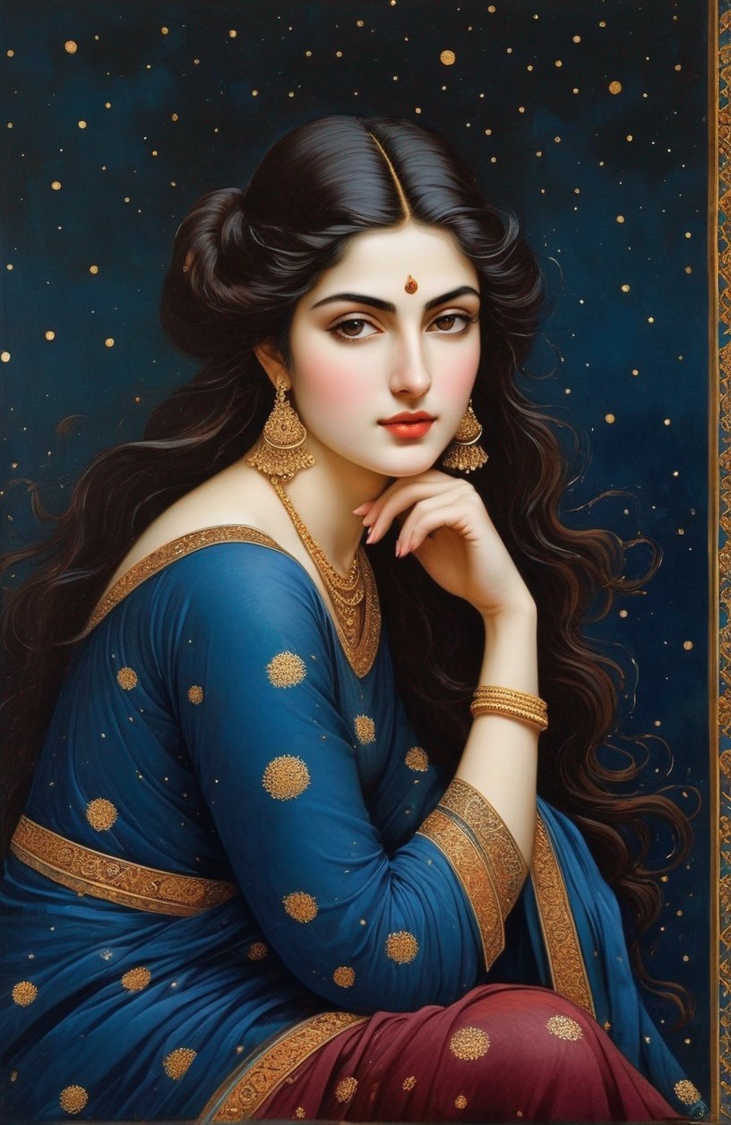 fashionable young woman - She walks in beauty, like the night — 3rd century Persian miniature art . dark sky-blue and dark gold, energy-filled illustrations, delicate pointillism, bold stencil, celestial, screen printing, organic (Padmanabha., whimsical, beautiful, poignant, touching. colors rose, gold, rust, burgundy, black.soft watercolor extra water in Art Deco by Annigoni, Egon Schiele, Milo Manara, Botticelli, Catrin Welz-Stein, Jean Metzinger, Klimt, perfect eyes, perfect handsface, highly detailed, complementary colors, hyper detailed. Watercolor and ink splatter, dynamic pose, dark blue background, unreal engine, greg rutkowski, loish, rhads, beeple, makoto shinkai and lois van baarle, ilya kuvshinov, rossdraws, tom bagshaw, alphonse mucha, global illumination, detailed and intricate environment